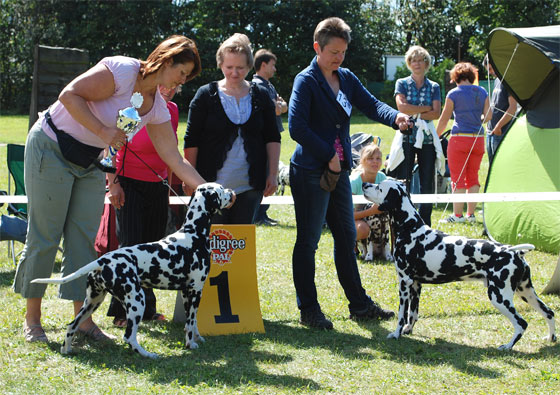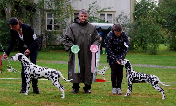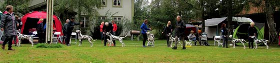 Eine kleine "Meute" von deutschen Dalmatinerleuten hat sich auf die Reise nach Stockholm gemacht. Nur Hunde aus dem Dalmatiner Verein Deutschland e.V. konnten es in die Platzierungen schaffen... Totti belegte an beiden Tagen den 2. Platz in der Zwischenklasse und Leander konnte in einer starken Championklasse den 3. Platz erringen ...danke Harald! | |