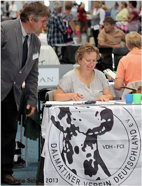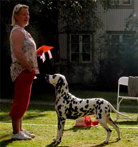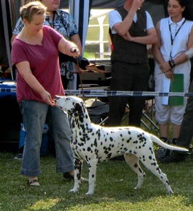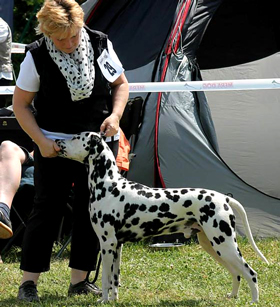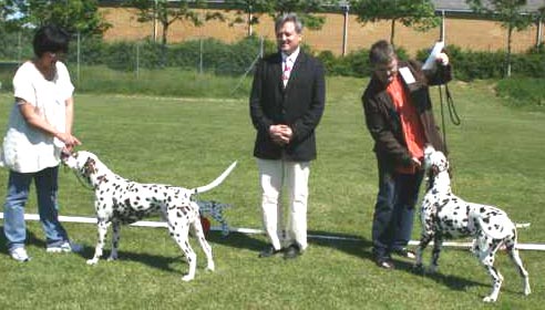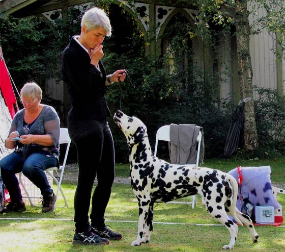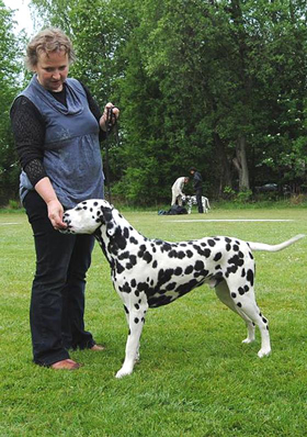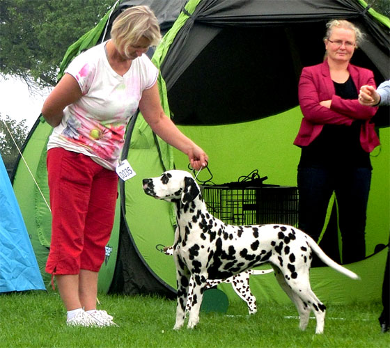 Rückkehr nach 18 Jahren…1997 vermittelte uns Aase Jakobsen „Perdita´s Keen Observer“ – unseren ersten Rüden aus Norwegen. 18 Jahre später haben wir mit großer Freude die „101-Show“ in der Nähe von Oslo richten dürfen. Eine liebevoll organisierte Show über 2 Tage, auf einem Platz mit typischem Ambiente wie man es in Skandinavien erwartet. Für uns eine gute Gelegenheit alte und neue Bekannte zu treffen, über die „gute alte Zeit“ zu quatschen und Erfahrungen auszutauschen. Auch wenn das Wetter die Aussteller und uns einigermaßen geärgert hat – es waren wirklich schöne Tage, vielen Dank dafür an alle Beteiligten! 18 Jahre – wie hat sich in dieser Zeit die Qualität der Hunde in Skandinavien verändert? Vor 20 Jahren fehlte es den Dalmatinern in Deutschland besonders an Typ, Knochenstärke und Temperament. Durch den Einsatz skandinavischer Blutlinien haben wir in diesen Punkten ganz deutliche Fortschritte erzielt! Die 70 Hunde in Norwegen hatten kaum Probleme mit der Kruppenlage und dem Rutenübergang – da haben wir in Deutschland noch Nachholbedarf. Die ausgestellten Hündinnen waren in ihrer Gesamtheit deutlich besser als die gezeigten Rüden. In der Bewegung gab es leider die größten Probleme. Nur wenige Hunde liefen korrekt in der Spur, viele „kreuzen“ in der Vorderhand/Hinterhand und häufig war vorne eine Art „Stechschritt“ zu beobachten. Wir haben auch die typvollen Köpfe aus der „alten Zeit“ vermisst. Nicht selten konnten wir runde Oberköpfe sehen, die in ihrer Größe nicht zum „Rest“ des Hundes passen wollten. Was die Aussteller in Skandinavien deutlich besser können, ist die Präsentation ihrer Hunde – absolut professionell! Unser Fazit: Es ist sehr schwer einen schönen Typ zu erarbeiten und dann für Generationen zu konservieren. Auf dem Weg dahin braucht man Glück, einen langen Atem und eine gute Portion „Selbstkritik“. | |