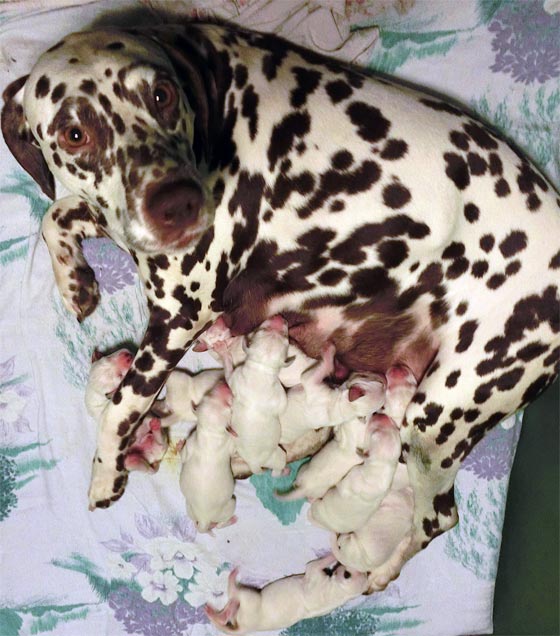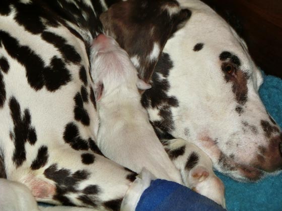 In der vierten Trächtigkeitswoche war unsere Suse durch einen Zecken – Virus fast vollständig gelähmt. Mit starken Medikamente ging es der Hündin von Tag zu Tag besser, aber was würde aus den Welpen ? Am 24.12. standen alle Zeichen auf Geburt... nur der zu tastende Welpe wollte nicht kommen. Am ersten Weihnachtsfeiertag also der Kaiserschnitt – 7 normal entwickelte Welpen, aber fünf waren schon im Himmel. Nach zwei Tagen hat uns noch eine kleine Hündin verlassen und so ist Suse auf dem Bild mit ihrem letzten Welpen „General Grievous“ zu sehen...